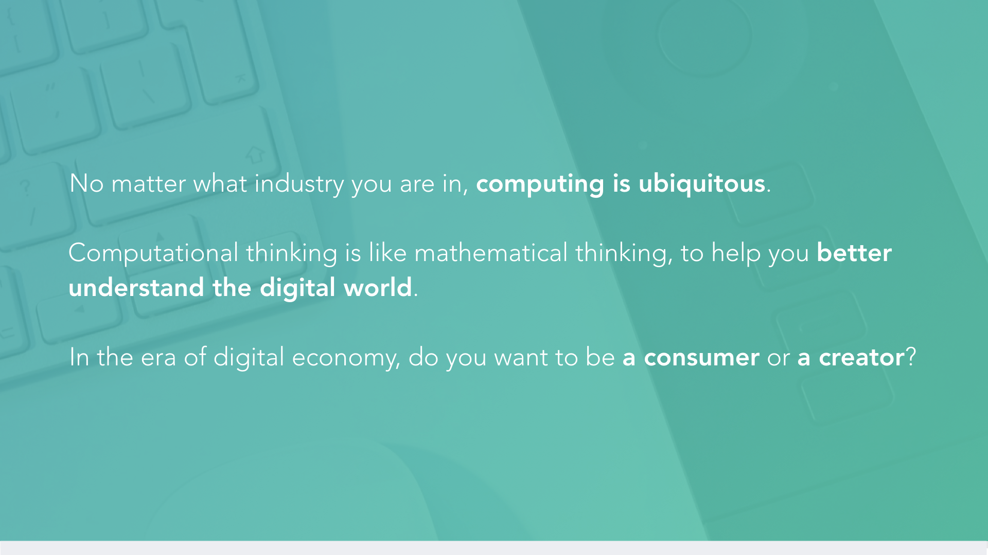 One way to iterate ourselves is to learn computational thinking and understand programming. So that, everyone can become the creator of the digital age, and even the leader.