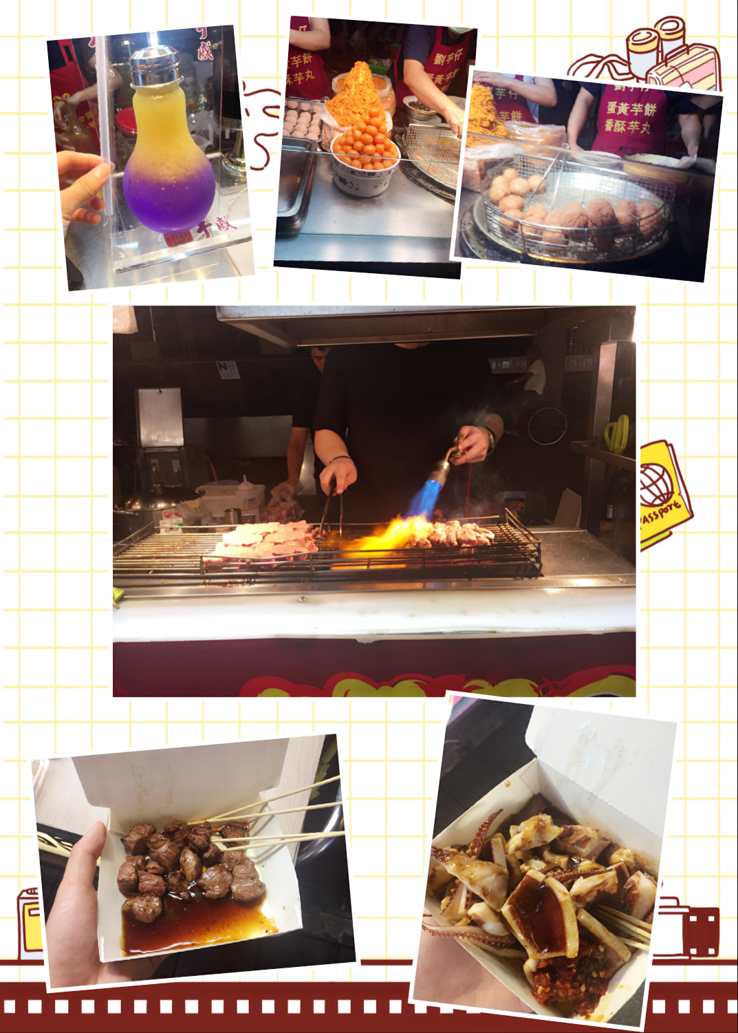 辦妥手續之後乘坐國光客運大巴前往市區,我第一晚住在紅米國際青年旅館,位於台北中央車站附近,交通便利。附近還緊鄰寧夏夜市。台北中央車站是三鐵共站(台鐵、高鐵、捷運)。安頓下來以後我們前往寧夏夜市。寧夏夜市規模不算大,但是吃的東西非常多(後來我們發現台灣的夜市都長差不多……)。一份小吃50TWD左右,分量都很足。
