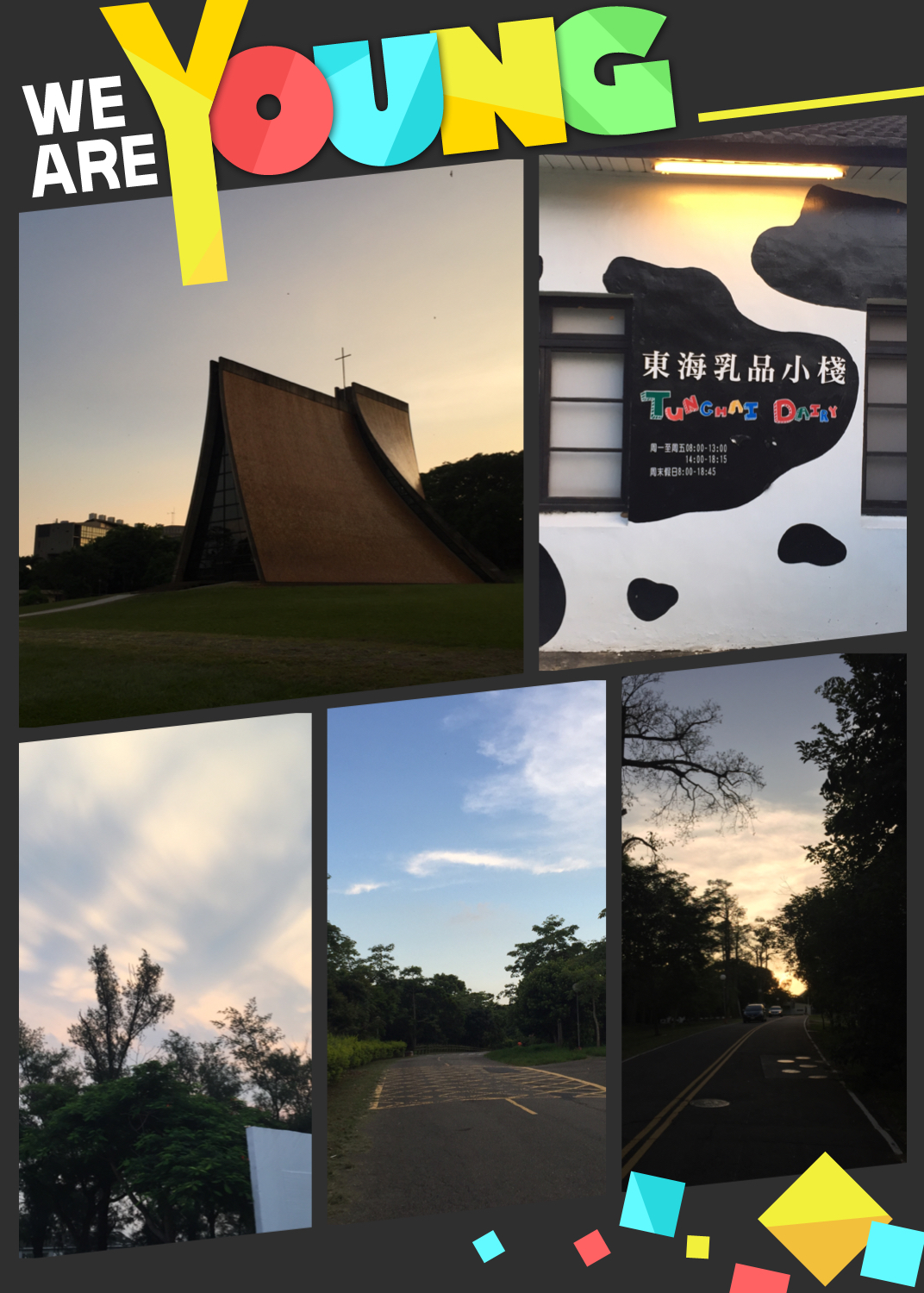 安頓好之後前往東海大學,這是台灣一所基督教新教背景的綜合大學,坐落在西屯區大肚山山麓,風景優美。東海大學有名的景點是東海乳品小棧(校園內有農牧場)、路思義教堂、文理路等。我們去的時候正巧日落時分,乳品小棧關門,於是在校園內部四處閒逛,欣賞景色。坦白說與我的學校相比,東海大學更具歷史感和自然感,漫步校園其中能讓人感受到校園文化的厚重感,這一點在大陸的許多大學都很罕見。
