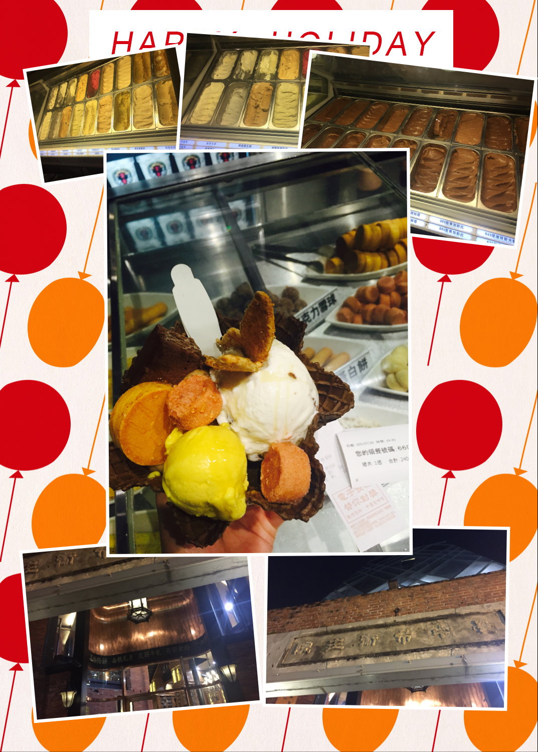 接下來一站是宮原眼科。宮原眼科在日據時代是一位叫宮原武熊的眼科醫師開的診所,光復后成立台中市衛生院,現在外觀保留了那個時代宮原眼科的結構與拱狀式騎樓,但是裡面是「日出蛋糕」的旗艦店,有多達50幾種口味的冰淇淋可以購買。宮原眼科冰淇淋光是巧克力口味,按甜度和可可產地、配料等劃分就有16種,還有水果、酸奶、抹茶等口味的冰淇淋。可以說是應有盡有。除了冰淇淋還可以選擇鳳梨酥、綠豆酥、蛋糕、蜂蜜烤餅等作為配料。唯一的缺點是不設堂吃,我們是拿著冰淇淋在馬路對面的FamilyMart吃。冰淇淋價格不算太貴,3球配聖代240TWD。